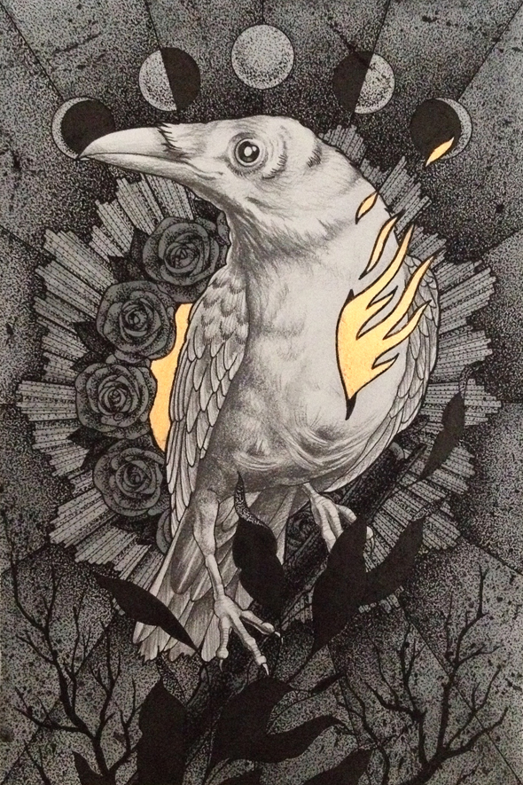 With this piece I just wanted to use pencil, black ink and goldleaf as materials. It’s an albino raven with a passionate heart.