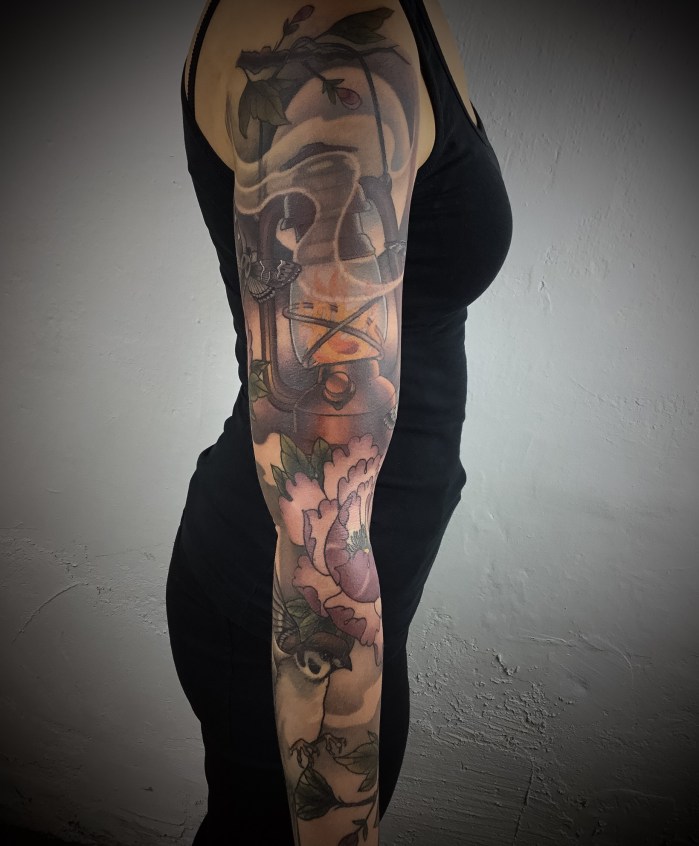 Sleeves are always a big commitment from artist and client. This one was a moonlit sleeve with moths, birds and peonies with a lantern lighting the way.