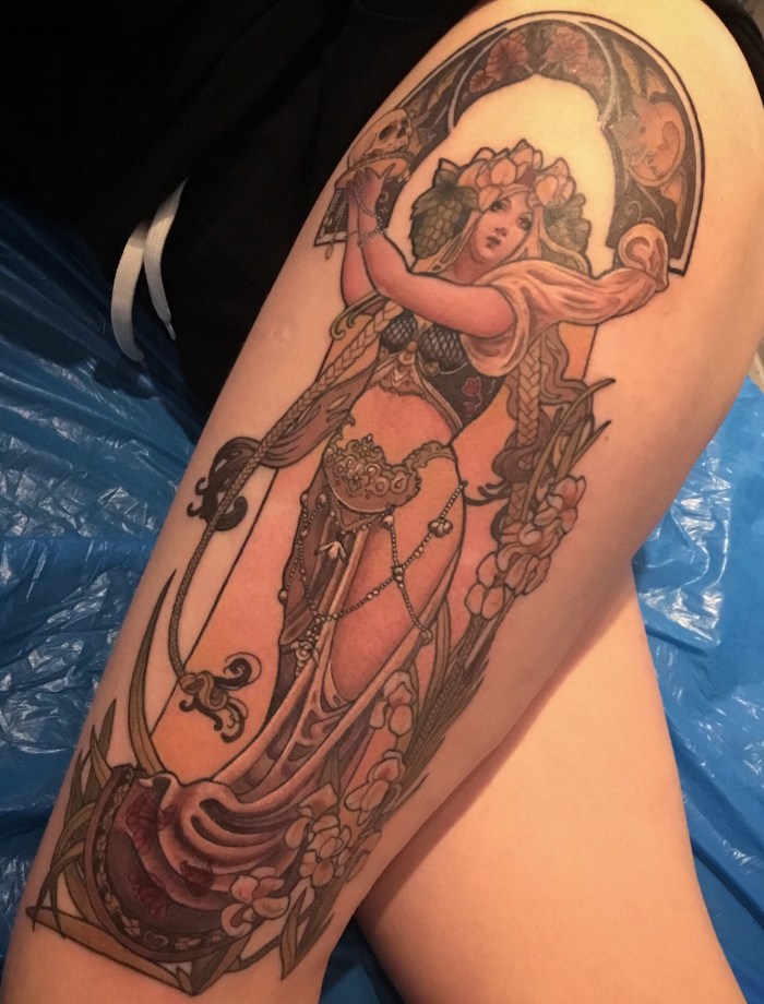 This tattoo is based on a Alphonse Mucha woman with some small changes made. Love these vintage kind of images and colors, even if the colors aren’t that thruthful in this picture.